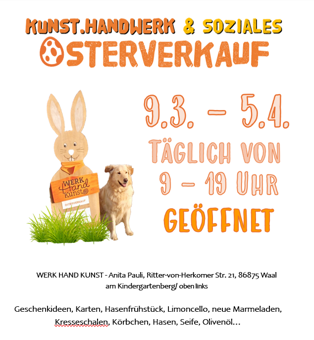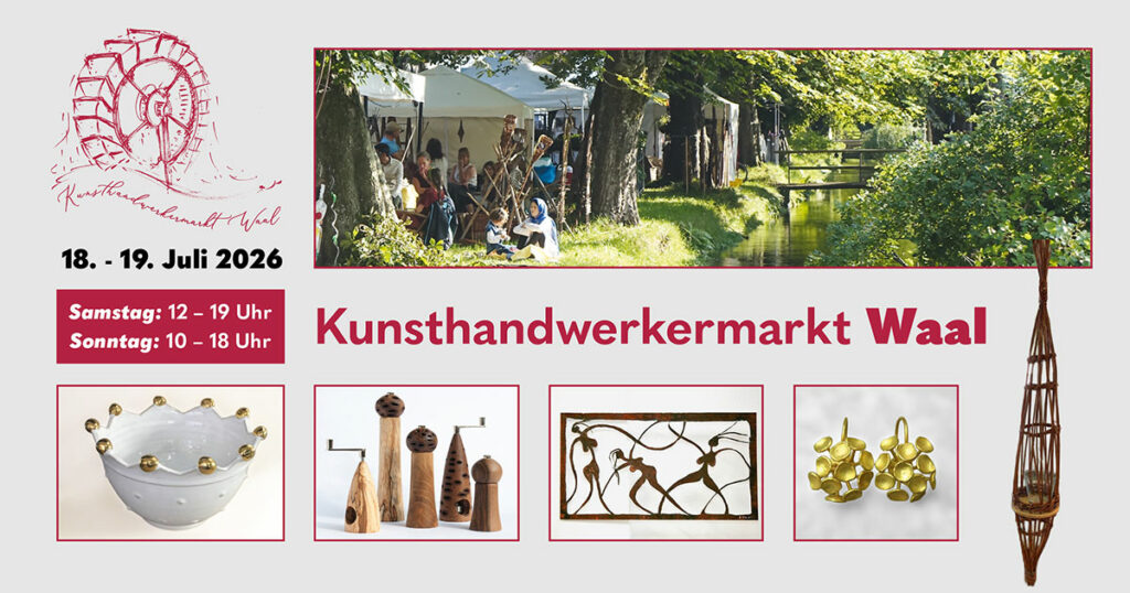Herzlich Willkommen auf der Homepage unserer WERKstatt für HANDwerk und KUNSThandwerk in Waal! Ihr findet uns auf der anderen Seite des Hauses – im Innenhof! Mit großem Stand und Keramik-Mal-Werkstatt!